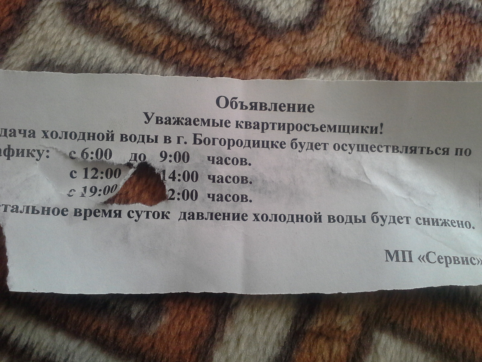 График подачи холодной воды в г. Богородицке в связи с большим разбором, обусловленным началом полива земельных участков: